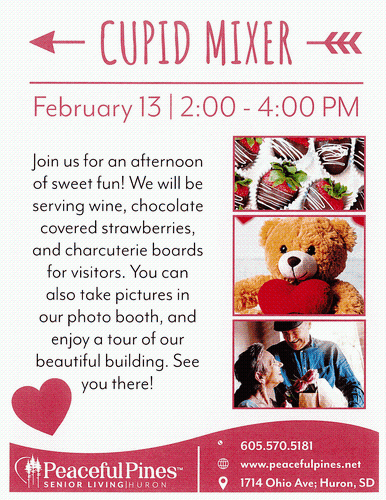 Come to Peaceful Pines for a Cupid Mixer. Enjoy wine, chocolate and charcuterie boards.