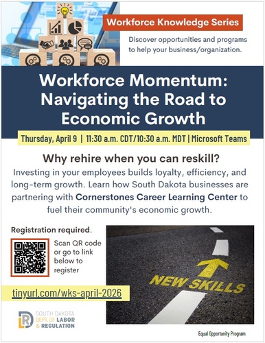 The South Dakota Department of Labor and Regulation is pleased to announce its next virtual Workforce Knowledge Series session. Our goal is to share insights on the topics that matter most to your business. The next session will be: Workforce Momentum: Navigating the Road to Economic Growth – Thursday, April 9, at 11:30 a.m. CDT (10:30 a.m. MDT)